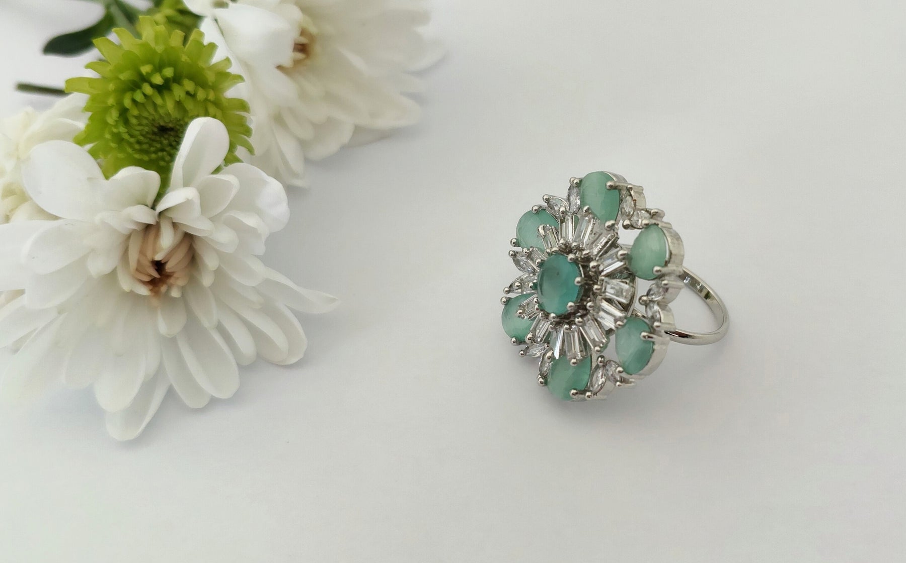 Make a statement with this stunning Hexa bloom ring. Designed with a floral base, it features semiprecious stones arranged as an array of petals, adorned with surrounding clear cubic zircon stones. Crafted from high-quality stainless steel, this ring is adjustable to ensure a perfect fit. Ideal for wearing as a sole piece of jewelry for your hand, this ring is perfect for party wear or gifting to friends and family.