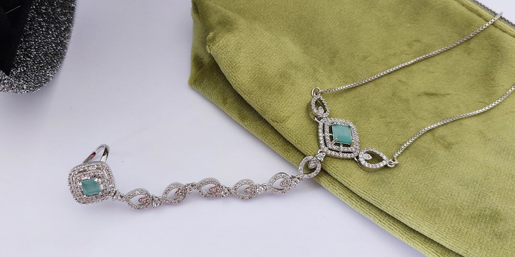 Elevate your style with this exquisite mint-coloured bracelet, seamlessly attached to a matching ring. Crafted from high-quality stainless steel, this unique piece features semi-precious stones and is adorned with sparkling diamantes. The intricate design and shimmering accents make it a perfect accessory for any occasion, adding a touch of elegance and sophistication to your ensemble. Ideal for weddings and festive occasions, this bracelet and ring set will make you shine and stand out in any crowd.